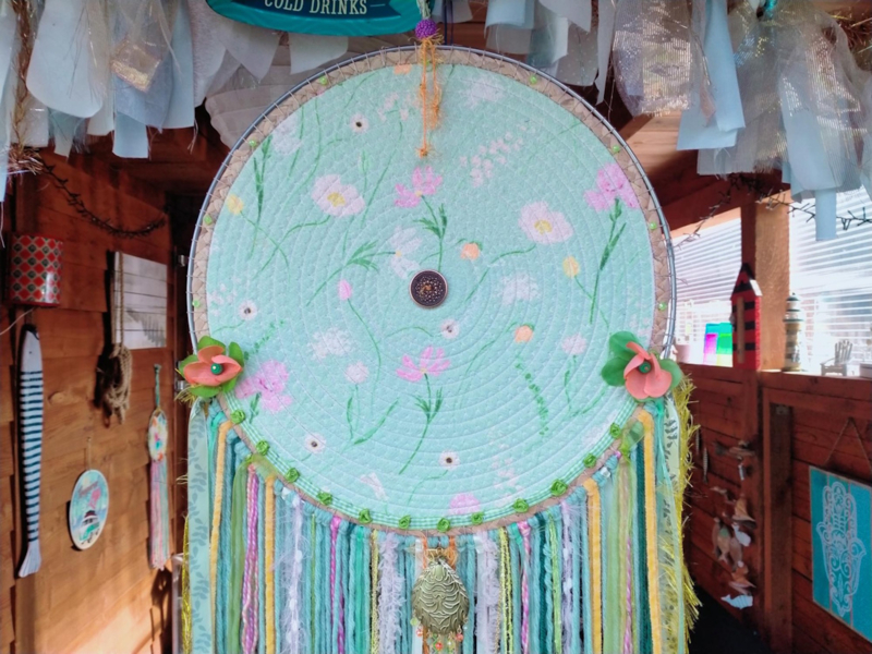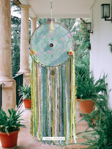 In deze handgemaakte dromenvanger in zachte najaarstinten in maat XXL, zitten de kleuren zachtgroen, roze, warm oranje, goud en geel verwerkt.