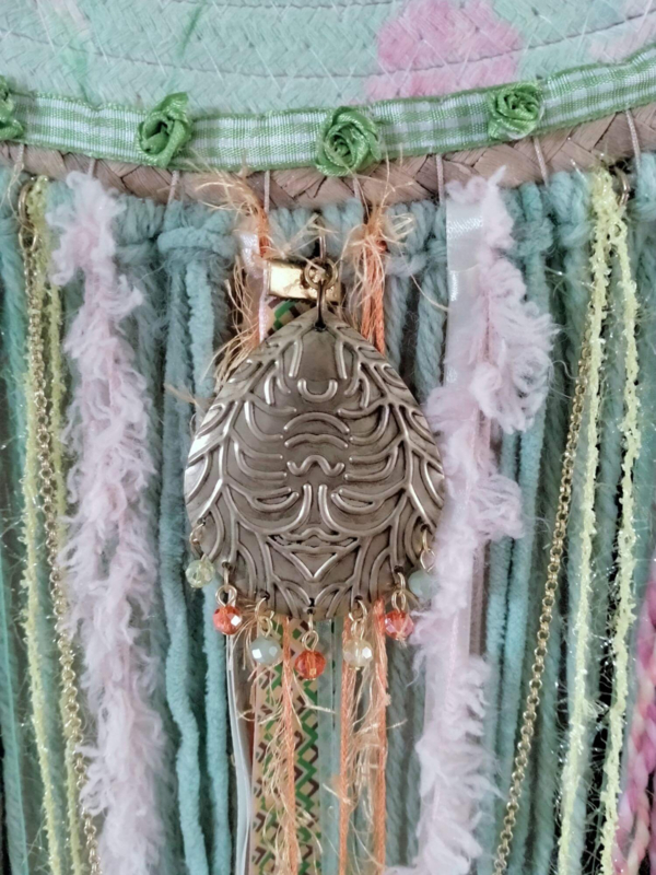 Gebruikte materialen: ring van macramé touw, wol, sierlint, filigraan hanger met facet geslepen glas rondellen, bloemenlint, shamballa kralen, fijn goudkleurig jasseron, metallook kralen, goudkleurige knoop van metaal, facet geslepen acryl kraaltjes en nylon bloemen.