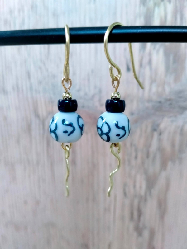 Delfts blauwe oorbellen met handgeschilderde bloemkralen. En schattig zijn ze, die bloemkralen in Delftsblauw waar onderaan hammered copperwire 'slangetjes' hangen. De ooorbellen zijn afgewerkt met donkerblauwe buiskralen en metalen kraaltjes. De oorbelhaakjes zijn zelfgemaakt en eveneens hammered copperwire en dit alles is in goudtint.