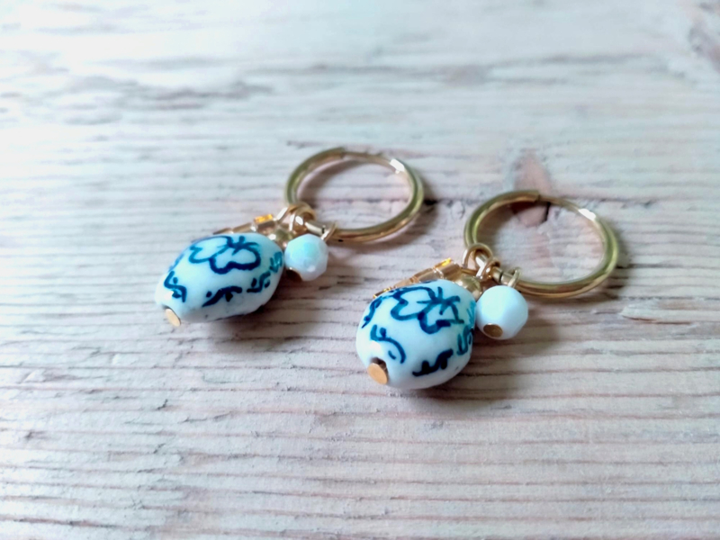 Goudkleurige creolen met Delfts blauwe vlinder kralen