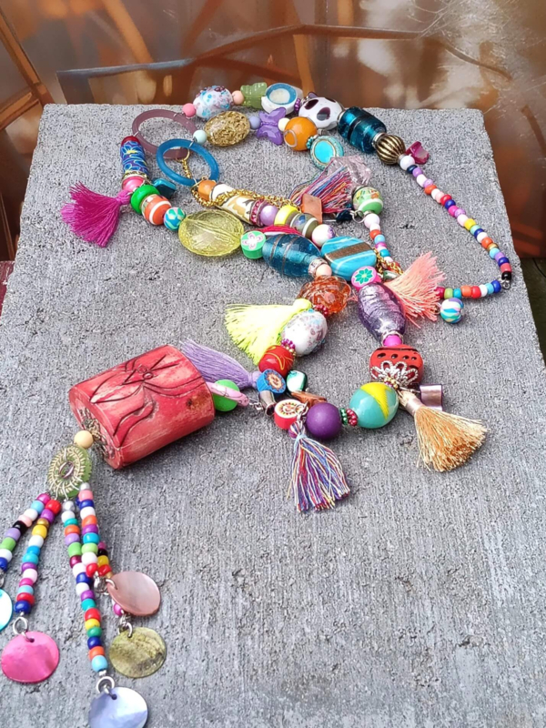 Deze Ibiza style ketting is voorzien van een extra metalen kettinkje, waaraan een vrolijk gekleurde polymeer kraal hangt. Verder gebruikt materiaal in deze hippe lange Ibiza style ketting: schelpkralen, glaskralen, Ibiza kwastjes, strass rondellen, tussenkralen, acryl kralen en ringen, glasringen, acryl vlinderkralen, rocailles, bone kraal en polymeer kralen.