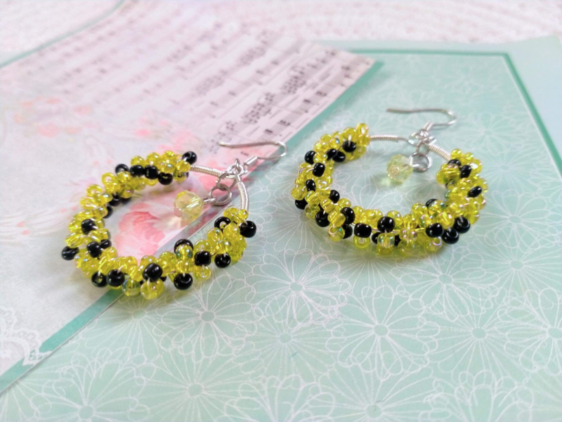 Rocailles oorringen geel/zwartDeze rocailles oorringen geel/zwart, zijn op copper wire geregen en met facet geslepen glas rondellen in dezelfde gele tint afgewerkt.Lengte oorringen 5 cm.Diameter oorbellen 3.5 cm.